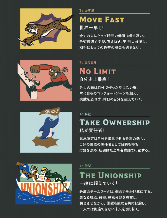 ユニオンテックでは、「BUILD A NEW STANDARD.(新しいあたりまえをつくる)」をミッションに掲げており、これを達成するための4つのバリュー「Go Beyond Value」を設けています。 そして、各バリューを最も体現していた社員を表彰するのが、New Standard Award。 MOVE FAST賞、NO LIMIT賞、TAKE OWNERSHIP賞と、それらすべて網羅した、Go Beyond MVP賞の4つで部門分けをしていました。 |