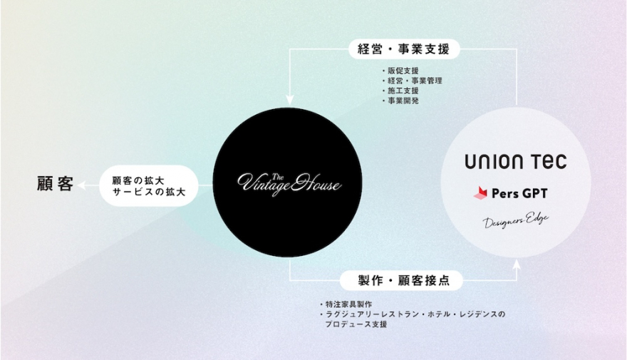 一方で、ザ・ヴィンテージハウスはユニオンテックグループに参画することで、ユニオンテックグループが有するデザイナーとの接点を活用し、より多くのお客様にサービスをお届けすることが可能となります。また経営支援・設計施工支援を受けることで、財務的にもサービスレベル的にも安定が見込まれ、加えて将来の幅広いビジネスの選択肢を得らえることになります。