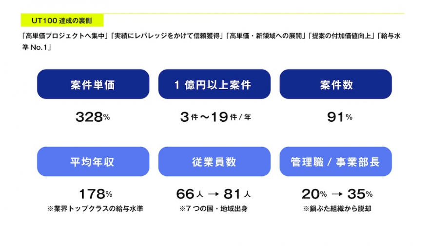 100人という人員制約のもと、「高単価プロジェクトへ集中」「実績を活用して信頼獲得」「高単価・新領域への展開」「提案の付加価値向上」の強化に集中しました。