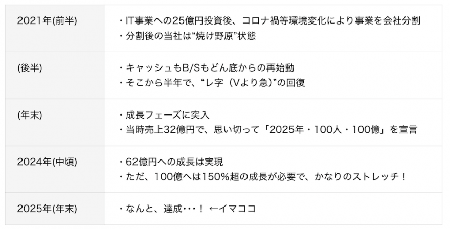 どん底からの“レ字(Vより急)” 回復の勢いで宣言した100億宣言「2025年までに社員100人で受注売上100億円」を、2025年12月に本当にギリギリ達成しました。