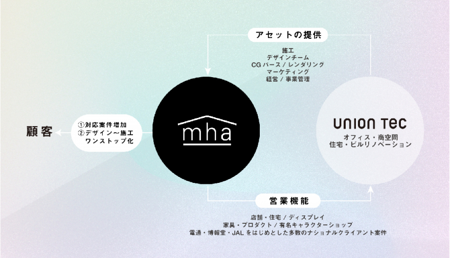 マウンテンハウスアーキテクツは、建築・インテリア・ディスプレイ・家具・プロダクトのデザインにおいて幅広い実績を持ち、その独自性と高い専門性が市場で高く評価されています。有名キャラクターのショップや電通・博報堂・JALをはじめとした多数のナショナルクライアントの案件を手掛けてまいりました。このたびのユニオンテックのグループジョインにより、グループ全体の提供サービスはさらに広がるナショナルクライアントにおいても強力な体制を構築することが可能となります。